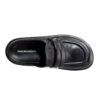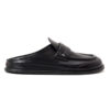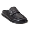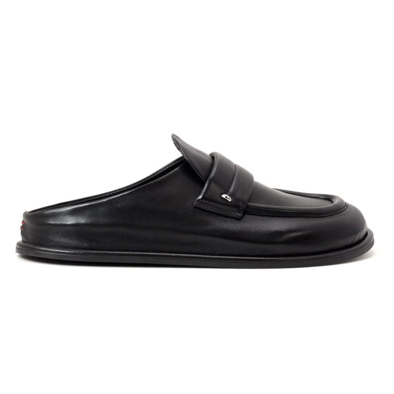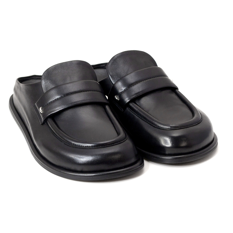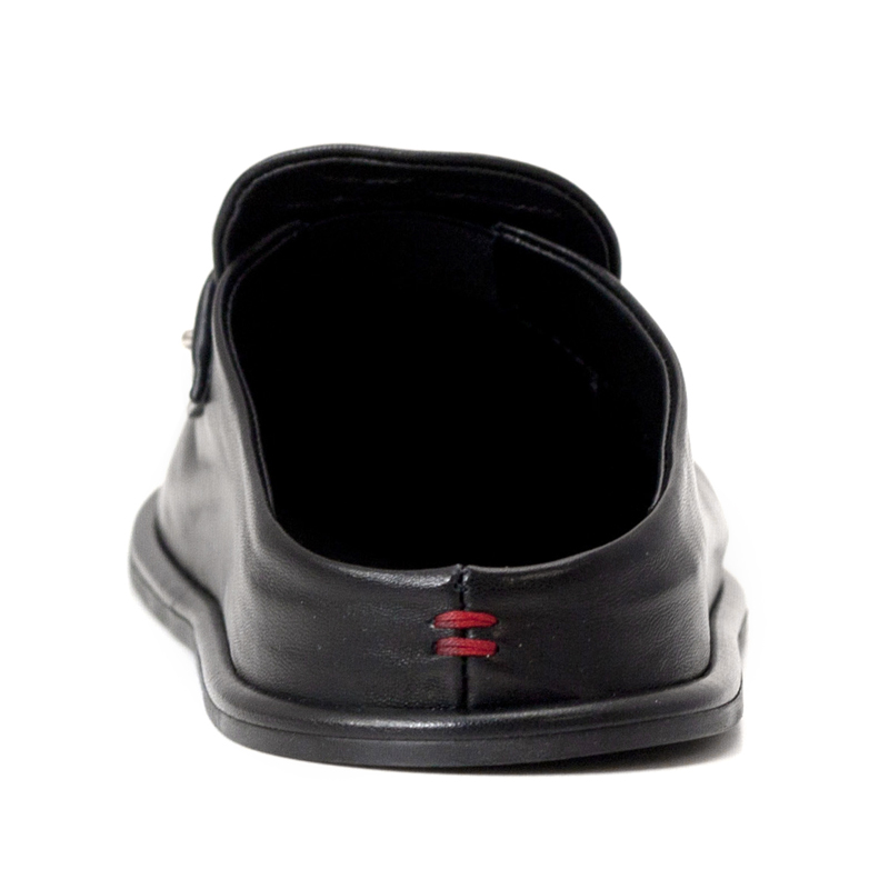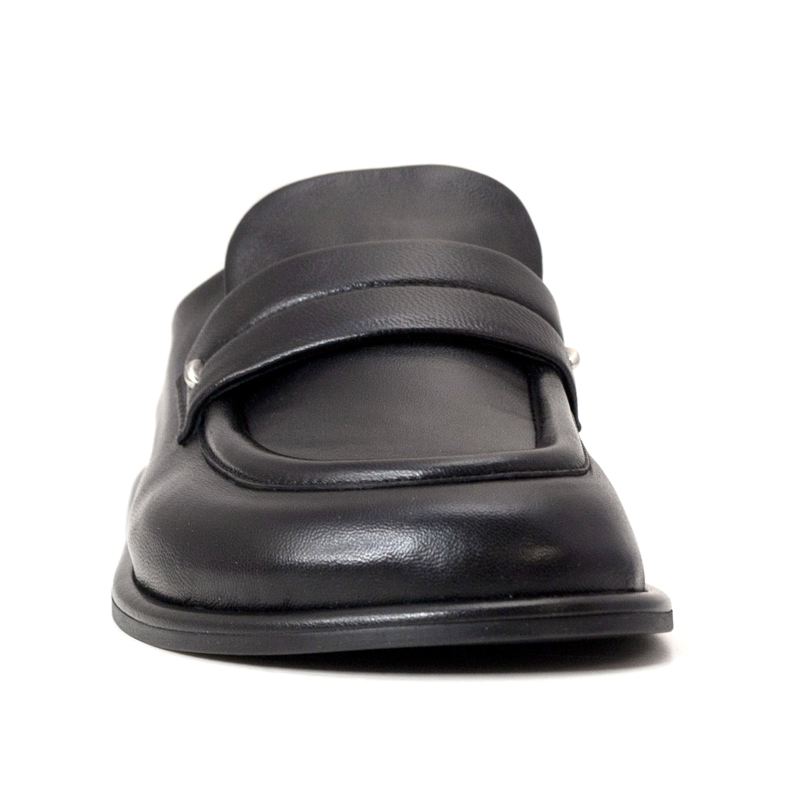 • These HALMANERA leather loafer mules redefine effortless elegance with a sophisticated backless silhouette. Crafted from premium, smooth black leather, they feature a structured square-toed box and a distinctive wide penny strap across the vamp, accented by a subtle metallic stud.