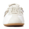 - Equipped with a slim, flat rubber sole in a classic gum or tan color for a retro athletic look.