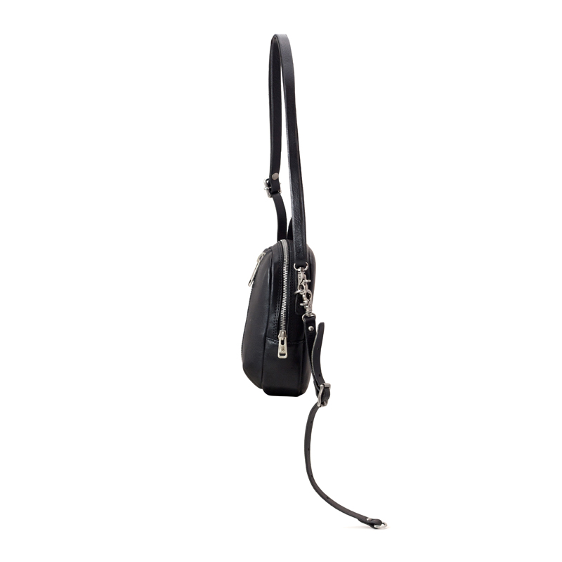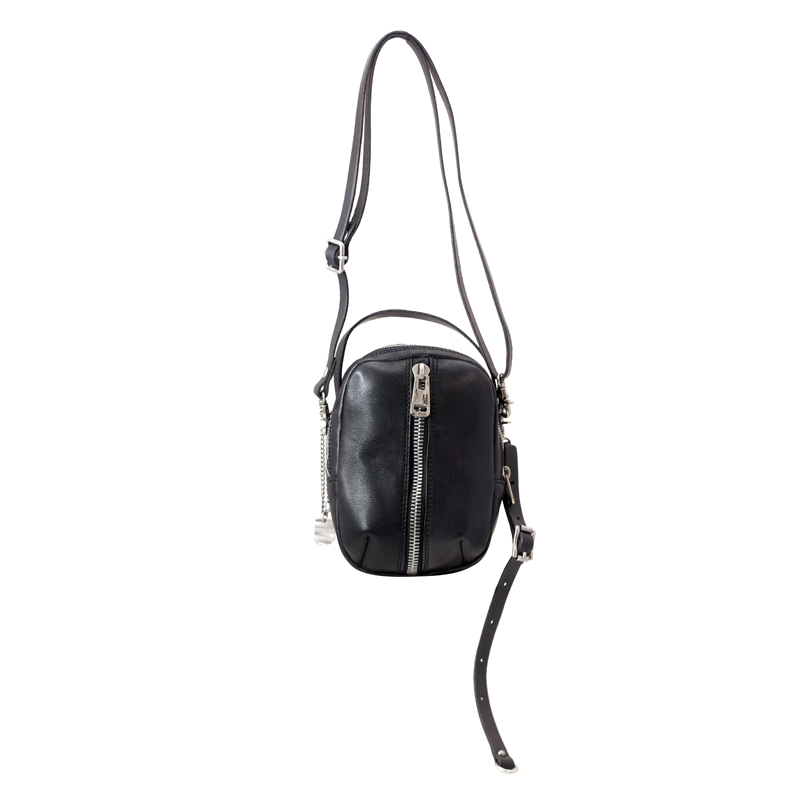 - 顶部拉链封口,配备可调节长短的皮革斜挎肩带,肩带末端保留了随性的长截设计。